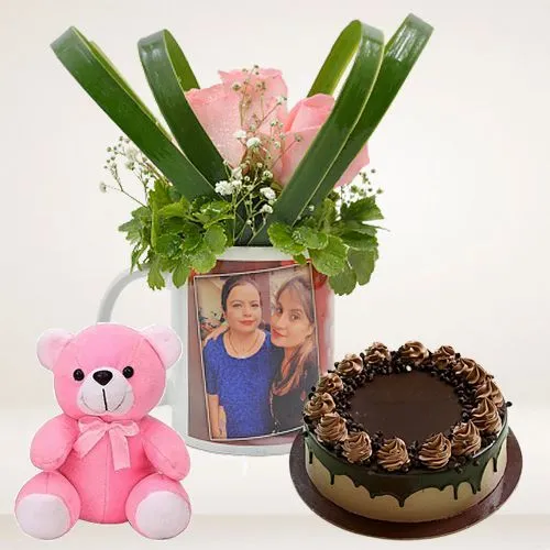 Mould your relationships into more special ones by sending this Alluring Personalized Photo Mug Filled with 3 Pink Roses which is added with a Chocolate Cake (500g) n a 6 inch Cute Teddy to the people you adore.