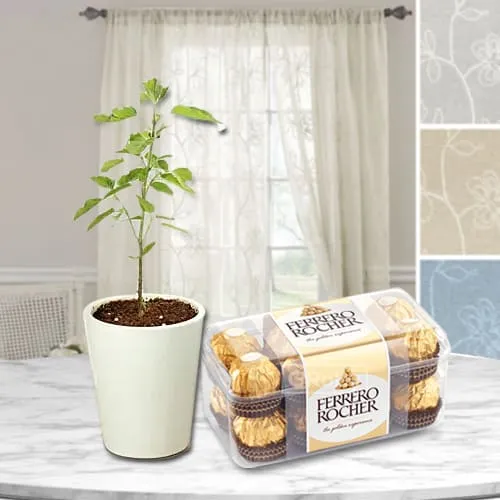 Love is best expressed by sending this gift of Auspicious Tulsi Plant in a Glass Pot with Ferrero Rocher Chocolate Box of 16 pcs to your near and dear ones.