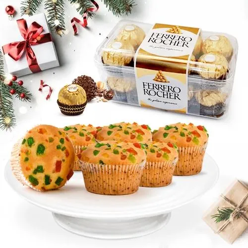 Deliver your message to your loved ones with this X_Mas gift of Blissful Ferrero Rocher Chocolates (16 pc) with 6 pc Tutty Fruity Muffins and make them feel special.