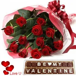 Pamper your loved ones by sending them this Captivating Valentine Gift of One Dozen Red Roses Bouquet with Be My Valentine Handmade Chocolates exclusively meant to convey your wishes in the best manner.