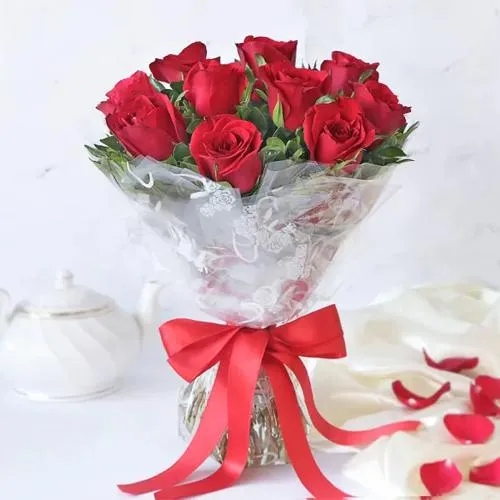 Have an exotic Valentines Day with your loved ones by gifting them this Charming Hand Bouquet of 10 Premium Dutch Roses to cast a magical spell upon them.