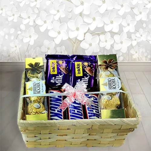 Order for delivery of Festive Essentials Treat Basket of Chocolates to your special one. This stunning Gift Basket is introduced with a variety of assortments like Cadbury Dairy Milk Crackle (36 gms), 2 pcs each of Ferrero Rocher (4 pcs pack) and Snickers (50 gms).
