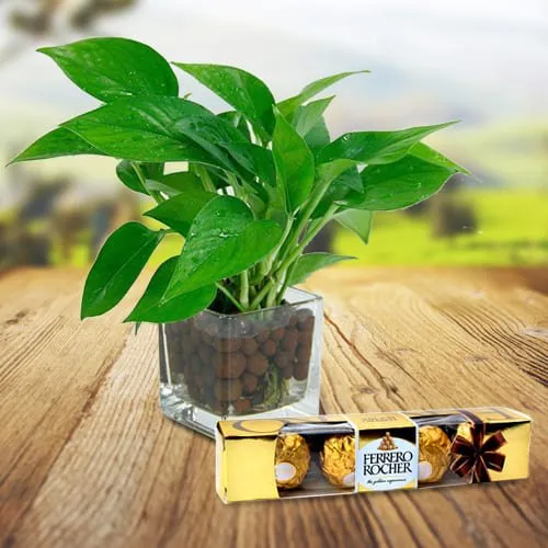 Amaze your loved ones by gifting them this Golden Money Plant in Glass Vase with 4 pcs Ferrero Rocher Chocolates Combo and make them crave for more.
