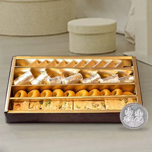 Haldirams Assorted Sweets in a Box with a Silver Plated Ganesh Laxmi Coin. This special Diwali Gift will make your loved ones feel happy .(Gross wt. 250 gms).