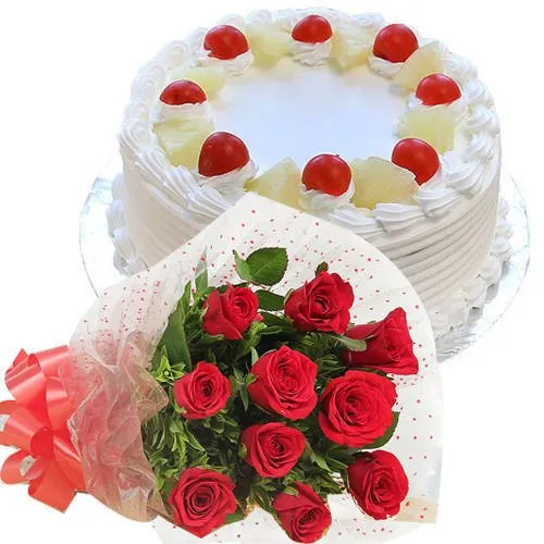 Spread smiles all over the lives of the people you love by sending them this toothsome 1/2 kg Pineapple Cake with Red Roses Bouquet that showers its beauty upon those people to make them happy.
