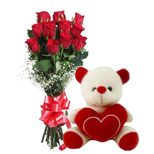 12 Exclusive Red Dutch Roses Bunch with Cute Love Teddy Bear