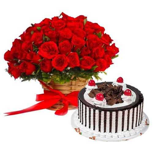 50 Dutch Red Roses Basket with 1/2 Kg. Black Forest Cake.