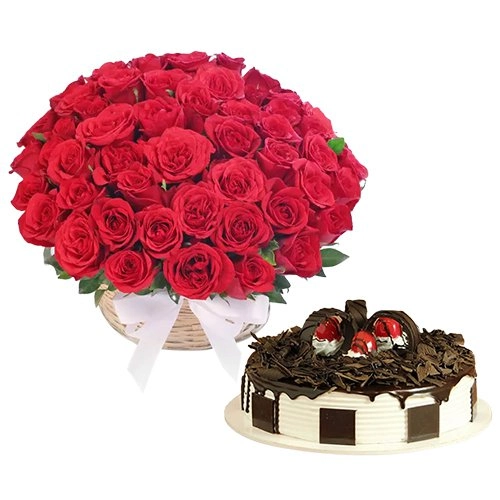 50 Red Roses with Black Forest cake 1 Kg from 5 star Hotel Bakery