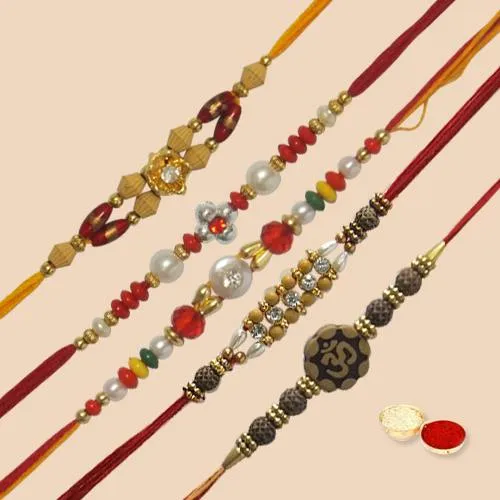 Nicely Gift Wrapped 5 Pcs Rakhi Set for your brother with free Roli Tilak and Chawal.