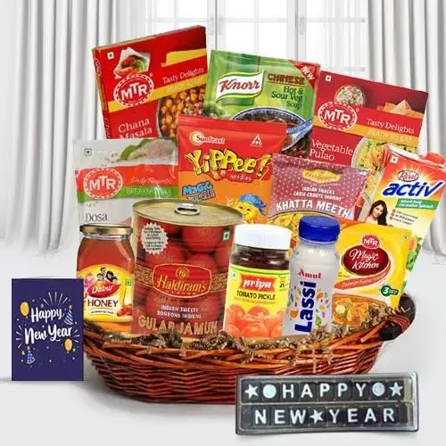 This new year have fun with your friends and family with this Conglomeration of Delightful Titbits and enhance your celebrations. This Basket is loaded with Amul Lassi (200 ml), Sunfeast Yippee Noodles � Masala (75 gm), MTR Magic Kitchen - Paneer Butter Masala Spice Mix (50 g), MTR Ready to Eat � Chana Masala (300 gm), MTR Ready to Eat � Vegetable Pulao (250 gm), MTR Dosa Mix � (200 gm), Haldirams Gulab Jamun (1 kg), Haldirams Namkeen � Khatta Meetha (150 gm), Priya Pickle - Tomato (Without Garlic, 300 gm), Dabur Honey (250 gm), Knorr Soup Powder - Chinese Hot N Sour Vegetable (47 gm), Real Activ Juice - Mixed Fruit (1 lt), Happy New Year Chocolates and a Happy New Year Greetings Card.