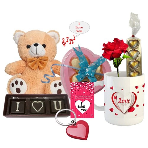 Create wonders in the life of the people you love by sending this Dashing Love Combo and make them your fan. This exquisite Set of gifts consists of 5 Pcs Homemade Golden Heart Chocolates, an "I Love You" Card, a Singing Teddy, I Love You Handmade Chocolates, 3 Pcs Heart Shaped Chocolates, a Velvet Rose, a Heart Shaped Key Ring and a Love Mug.