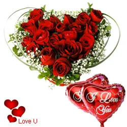 12 Dutch Red Roses in Heart Shape Arrangement with 2 Heart Shape Balloons