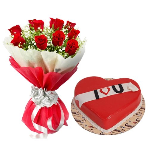 12 Red Dutch Roses Bouquet with Heart Shaped Cake 1 Kg