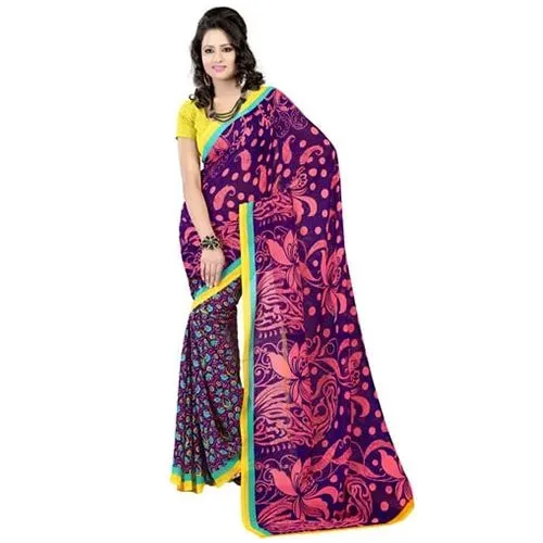 Beguiled reverences for your beloved maiden will be yielded from everywhere, when she will embellish her docility in your this present of Exquisite Enchant Faux Georgette Saree. This Drapery shows a Pastiche-Styled All Over Print over a Vivid Blue Background, a Double-Hued Border of Lucid Blue and Lime and a 'Pallu' of Dendritic Print.