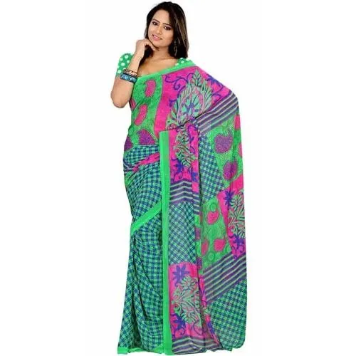 Refresh the worn-out-by-work mood of your wife with elated spirits by presenting her this Exquisite Enhancement Chiffon Saree and give birth to some prized moments of togetherness between you two. This Saree displays a Throughout Pattern of Varied Motifs over a Psychedelic Background and a Petite Border of Color Green.
