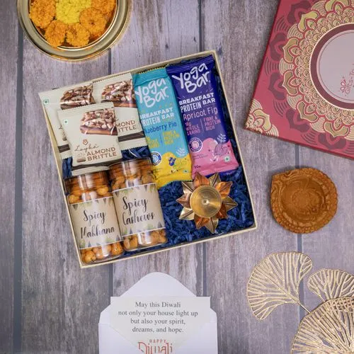 Celebrate Diwali with this thoughtfully curated gift box, perfect for those who love a blend of flavors and festive charm. Indulge in spicy roasted makhana (60g) and cashews (100g), providing a crunchy and savory treat. Satisfy your sweet tooth with Loyka Almond Brittle (50g), and enjoy the natural goodness of Yoga Bar Apricot Fig (50g) and Blueberry Pie (50g), perfect for a healthy snack. Illuminate your festivities with the serene glow of the copper lotus diya and traditional mud diya, adding a touch of elegance and warmth. Presented in a reusable gift box, this set combines flavor, health, and light to make your Diwali celebrations truly special.